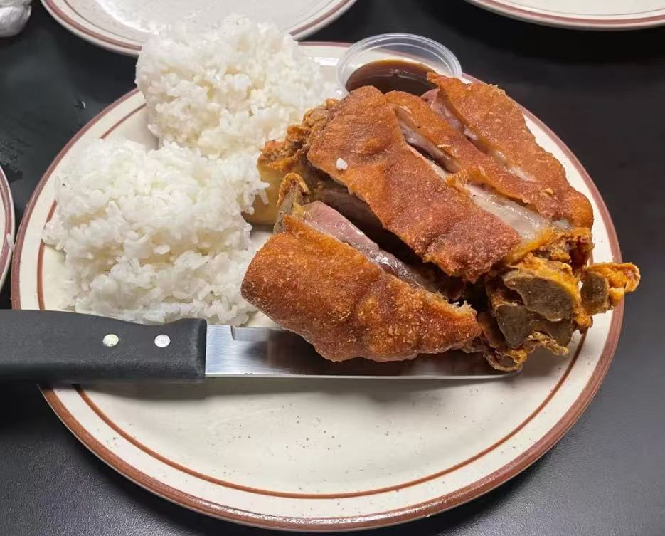 特色菜品:猪肘饭:外皮经高温烤制后酥脆爽口,咬开能听到 “咔嚓” 声响;肉质口感稍显紧实(略带柴感),入味程度相较于其他菜品略逊一筹,但搭配米饭与蘸料食用,仍有独特风味,适合喜欢酥脆口感的食客。